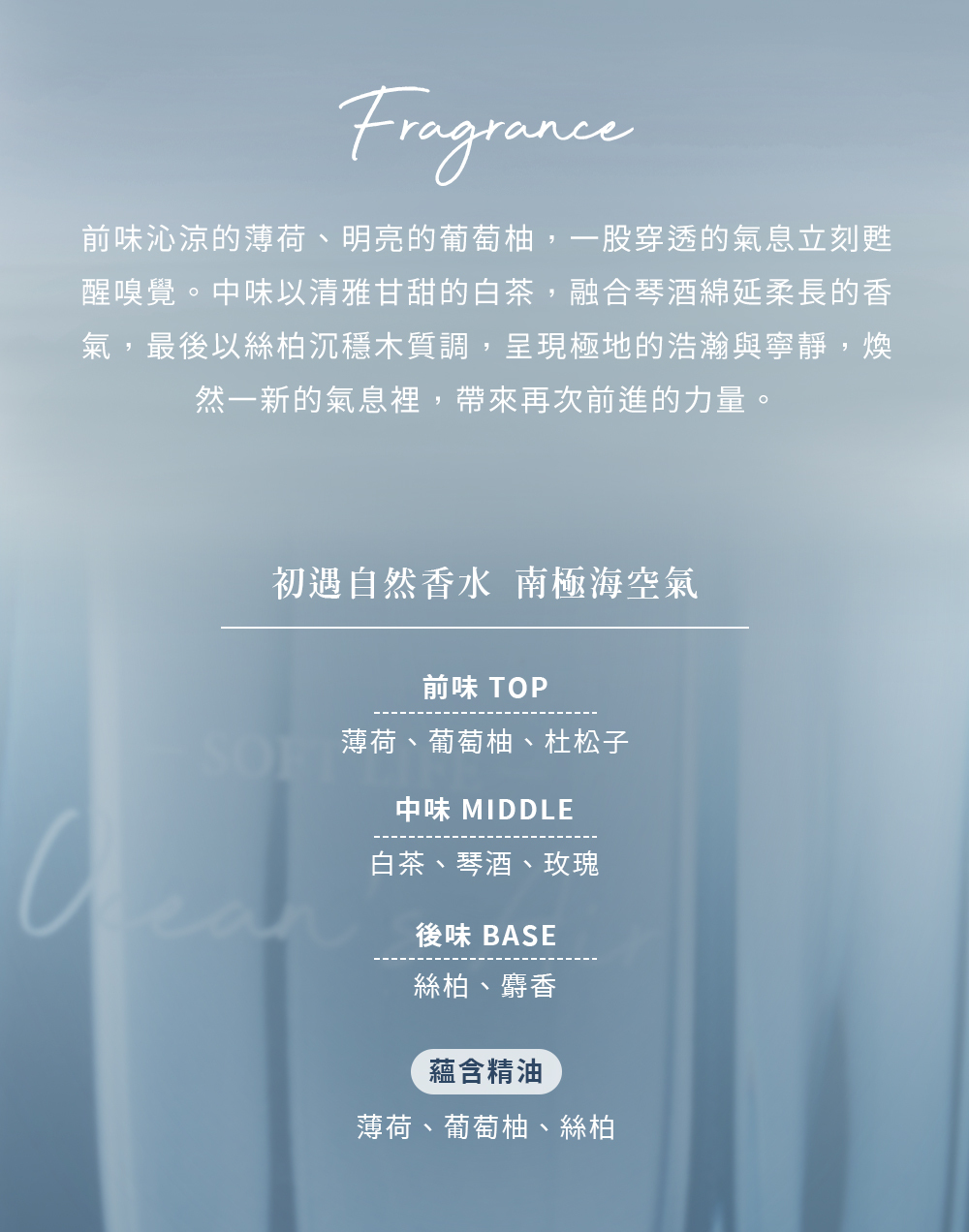最後以絲柏的沉穩木質調,呈現極地的浩瀚與寧靜,